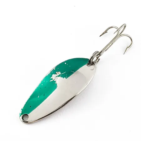 Nickel- och gröna ytor präglar profilen på detta 1 1/2" (4 cm) skeddrag, ett klassiskt exempel på amerikansk redskapsdesign från Seneca. Med en vikt på 1/4 oz (7 g) är det ett mångsidigt kastbete med en viktfördelning utformad för distans. Om man vänder på metallkroppen ser man den ikoniska stämpeln 'LITTLE CLEO WIGL-LURE A SENECA LURE', ett bevis på dess amerikanska ursprung. Den målade sidan har en livfull grön nyans över halva ytan, med ett visst slitage som stämmer överens med skicket 4/5. Konstruktionen består av en rejäl fjäderring och en standard trekrok. För samlare som söker specifika varianter identifieras detta exemplar med produktkod 21959. Den polerade nickelsidan har bevarat en hög glans som ger en skarp kontrast mot den gröna färgen.