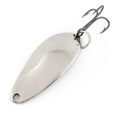 På baksidan av detta 4 cm (1 1/2") skeddrag i högpolerad nickel syns den tydligt instämplade originalmärkningen som identifierar det som en Little Cleo Wigl-Lure. Med en vikt på 7g (1/4oz) har detta exemplar från Senecas produktionstid den klassiska puckelryggade formen som är utformad för långa kast. Den droppformade kroppen är märkt med "A Seneca Lure" och "USA", vilket speglar dess ursprung från mitten av seklet. Detta exemplar har tilldelats skicket 5/5, då pläteringen är anmärkningsvärt ren och den mörka originaltrekroken fortfarande är vass och ordentligt fäst med sin fjäderring. Detta bete, som är katalogiserat under produktkod 22625, är ett välbevarat exempel på amerikansk fiskehistoria. Hålet framtill är precisionsborrat för linan, medan det kraftiga godset ser till att draget når rätt djup vid både kast och trolling.