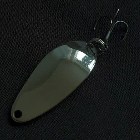 Med en glänsande klassisk nickelfinish framhäver den här USA-tillverkade skeddragskroppen på 7 g (1/4 oz) den ikoniska puckelformade designen som samlare eftersöker. Med en längd på 4 cm (1 1/2") förblir Seneca Little Cleo ett av de mest välkända skeddragen för spinnfiske som någonsin tillverkats i USA. Detta specifika exemplar, identifierat med produktkod 22825, uppvisar ett mycket gott skick med betyget 5/5 och har bibehållit sin ursprungliga lyster över hela metallytan. Ett fästhål är synligt vid den bredare basen, medan trekroken är fäst vid den avsmalnande änden med en robust fjäderring. Senecas tillverkningsstandard är tydlig i den jämna stansningen och den konsekventa pläteringen. Nickelbeläggningen ger en blank, reflekterande yta som är utformad för att reflektera ljuset effektivt vid invevning.