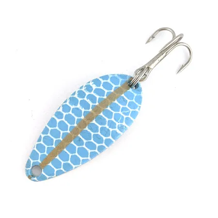 Detta klassiska skeddrag mäter 3 cm (1 1/4") i längd och har ett karakteristiskt blåvitt bikupemönster med en framträdande vertikal guldlinje. Baksidan av det polerade draget är tydligt stämplad med namnet "LITTLE CLEO", ett kännetecken för den ursprungliga tillverkningen från Seneca Lure Company innan märket förvärvades av Acme i början av 1980-talet. Med en vikt på 5g (3/16oz) inkluderar utrustningen en robust silverfärgad trekrok och en stark fjäderring, designad för pålitligt kastfiske eller trolling. Detta specifika exemplar, identifierat med produktkod 23377, är i oanvänt skick och uppvisar den höga kvalitet på finishen som man förväntar sig av vintage-utrustning tillverkad i USA. Vikten och den droppformade profilen är typiska för Senecas ursprungliga design, avsedd för en mängd olika sötvattensarter. Det är ett välbevarat stycke sportfiskehistoria som har behållit sin ursprungliga lyster och sina skarpa färgdetaljer.
