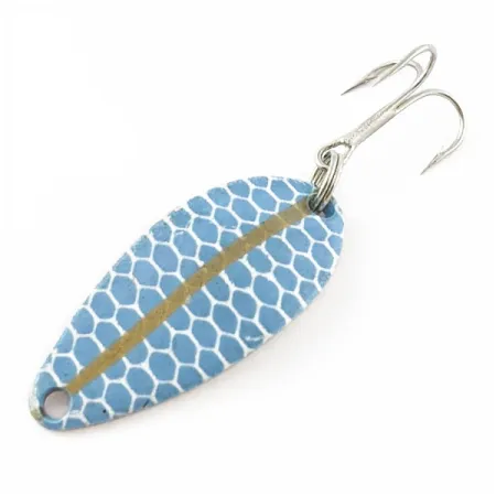 Den förnicklade baksidan ger en högreflekterande bas för detta skeddrag från en tidig produktion. Med en vikt på 5 g och en längd på 3 cm har detta exemplar ett karakteristiskt blått bikakemönster som delas av en tydlig vertikal guldstrimma. Detta är en originalproduktion från Seneca, identifierad med produktkod 24346, och tillverkades innan Acme Tackle Company förvärvade varumärket i början av 1980-talet. Att hitta en Little Cleo från Seneca-eran i detta skick är en raritet för dem som följer utvecklingen av den ikoniska puckelryggiga designen. Draget är oanvänt och har kvar sin fabriksfinish. Det är utrustat med en ren trekrok fäst via en robust fjäderring i aktern, medan nosen har ett förborrat hål för lininfästning, redo för ett beteslås eller direktknut. Tillverkat i USA, och hantverket återspeglar den kvalitet som gjort Little Cleo till en stapelvara i fiskelådor under decennier.
