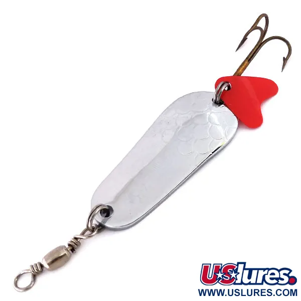 En klassisk hamrad nickelfinish definierar framsidan på detta skeddrag från mitten av århundradet, utformat för att reflektera ljus i brutna mönster under ytan. Betet väger 16g (3/5oz) och mäter 4,7cm (1 3/4"), med en karakteristisk droppformad profil stämplad med det ikoniska "Shakespeare"-namnet på den släta baksidan. Tillverkad av William Shakespeare Co. i Kalamazoo, Michigan (produktkod 10213), representerar detta drag arvet från företaget som grundades av fiskvisionären William Shakespeare 1897. Exemplaret är i 5/5-skick, med en strålande metallisk lyster och ren hårdvara. För extra visuell kontrast är ett lysande rött hjärtformat lockblänke i plast fäst vid den bakre fjäderringen tillsammans med en vass bronserad trekrok. Ett kraftigt lekande är fabriksmonterat i nosen, vilket gör betet redo att fästas direkt på en stål- eller monofilament-tafs.