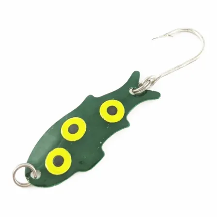 Grodmönster har länge varit en stapelvara i betesboxar för lätt fiske, och den djupgröna finishen på denna Shoff's Big Triple Teazer framhäver den klassiska amerikanska betesdesignen. Med en längd på 3,5 cm och en vikt på 2 g har detta lilla skeddrag tre tydliga gula huggpunkter med svarta centrum placerade längs sidan. Den fiskformade siluetten har en karaktäristisk skåra i stjärten och är utrustad med en vass enkelkrok fäst med en robust fjäderring. Detta exemplar från Shoff’s, tillverkat i USA med produktkod 24022, är i skick 5/5, vilket syns på den bevarade lystern i originalfärgen och hårdvarans goda skick. Att kasta detta lätta bete med lätt eller ultralätt utrustning möjliggör exakt presentation nära växtlighet och strukturer i vattnet.