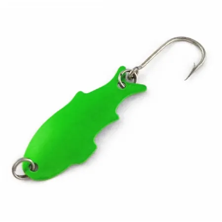 Detta skeddrag i metall har en livlig neongrön finish och en tydlig fiskformad profil som kännetecknar Shoff's Big Triple Teazer. Detta exemplar är tillverkat i USA, bär produktkoden 24024 och uppvisar den enkla funktionalitet som är synonym med klassiska amerikanska finesse-beten. Med en låg vikt på 2 g passar betet utmärkt för fiske med tunna linor där en mindre profil krävs för att locka till hugg. Kroppen mäter 3,5 cm och har en rad skåror längs den nedre kanten som bidrar till dess karaktäristiska betesfisksiluett. Just detta exemplar är i skick 5/5, med en jämn och solid färgyta samt rena metallkomponenter. Det levereras monterat med en enkelkrok med brett gap via en robust fjäderring, medan en matchande fjäderring i nosen ger en säker fästpunkt för linan.