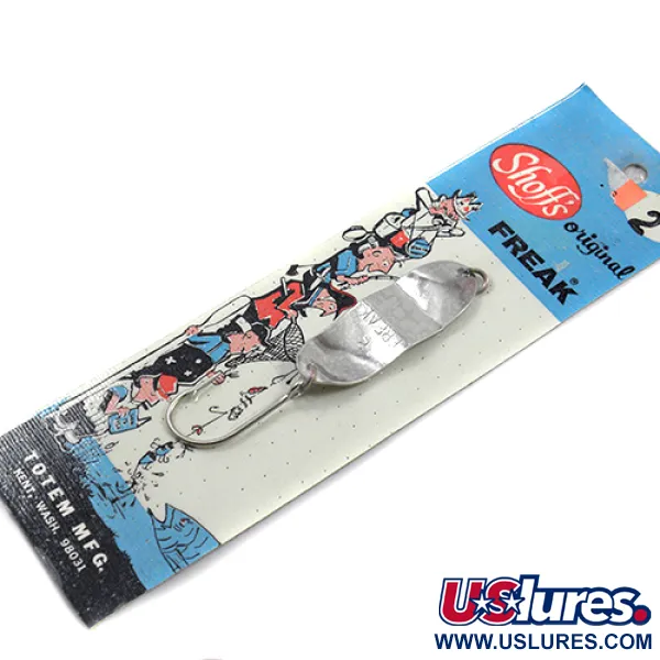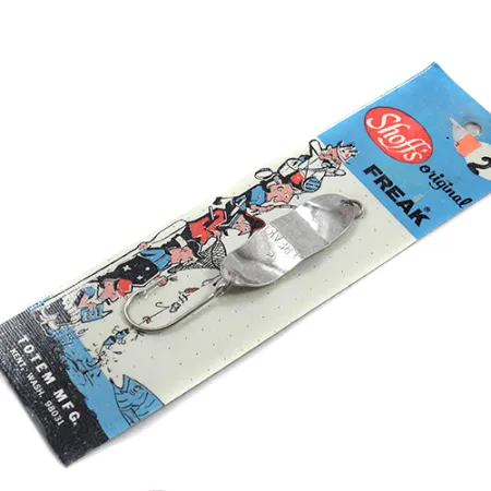 På den reflekterande silverskeden finns numret "2" tydligt stämplat tillsammans med modellnamnet "FREAK", vilket identifierar detta klassiska skeddrag från Nordväst. Tillverkat under varumärket Shoff's och distribuerat av Totem Mfg. i Kent, Washington, visar detta 5,5 cm (2 1/4") drag prov på hantverksskickligheten hos amerikansk vintage-utrustning. Silverpläteringen är exceptionellt ren eftersom varan är oanvänd och behåller sin ursprungliga lyster utan tecken på ålder eller slitage från förvaring. Med en vikt på 12 g (2/5 oz) är skeden utrustad med en kraftig enkelkrok designad för säkra mothugg. Den ursprungliga förpackningen pryds av charmiga illustrationer av sportfiskare från mitten av århundradet, vilket ger en historisk karaktär till produktkod 1885. Dess karaktäristiska form och mönstrade yta är kännetecken för en design avsedd för spinnfiske eller trolling under olika vattenförhållanden.