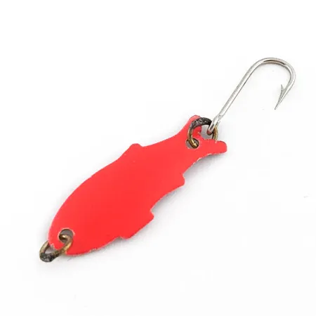 På baksidan av detta skeddrag i metall finns namnet 'SHOFF'S TRIPLE TEAZER' tydligt stämplat, ett signum för Shoff's Tackle Company från delstaten Washington. Med en vikt på 1/32 oz (1,1 g) är detta ultralätta bete uppbyggt kring en tydligt fiskformad kropp i ett tvåfärgat rött och vitt mönster. Framsidan är täckt med ett djupt rött pigment, medan baksidan visar den metalliska silvervita basen med den stämplade märkningen. Detta exemplar har produktkod 22344 och håller skicket 5/5, med välbevarad färg och originaldelar. Det är utrustat med två fjäderringar i mässing och en enkelkrok i silverfinish som förblir vass och redo för fiske. Konstruktionen är utformad för finessfiske som spinnfiske eller trolling efter öring och abborrfiskar, och betonar en profil som efterliknar små betesfiskar.