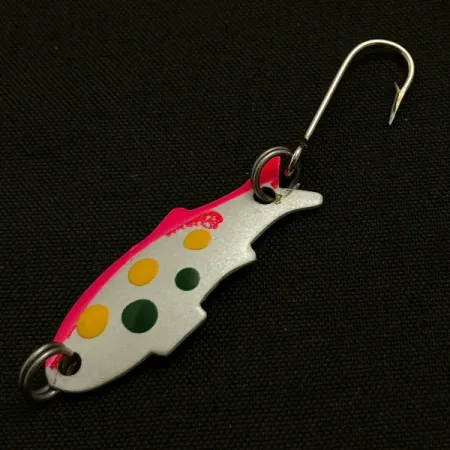 Med en vikt på endast 1,1 g (1/32 oz) är denna Shoff's Triple Teazer ett litet men mycket detaljerat exempel på amerikansktillverkade beten för finesse-fiske. Det 3 cm (1 1/4") långa draget, med produktkod 23537, har en metallkropp med silverfinish och en klarrosa ryggstrimma. En serie med tre gula och två skogsgröna prickar är målade längs sidan, vilket skapar ett mönster med hög kontrast mot den blanka metallen. I skick 5/5 är lacken helt intakt och metallytorna är rena. Monteringen inkluderar två fjäderringar och en enkelkrok baktill, vilket är den typiska riggningen för denna specifika modell avsedd för lätt spinnfiske. Även om katalogen listar grundfärgen som koppar, är den synliga pläteringen på detta exemplar reflekterande silver. Den trappstegsformade stjärtprofilen och den fiskliknande silhuetten definierar Triple Teazers fysiska karaktär och gör det till ett specialiserat verktyg för fiske efter öring eller abborrfiskar.