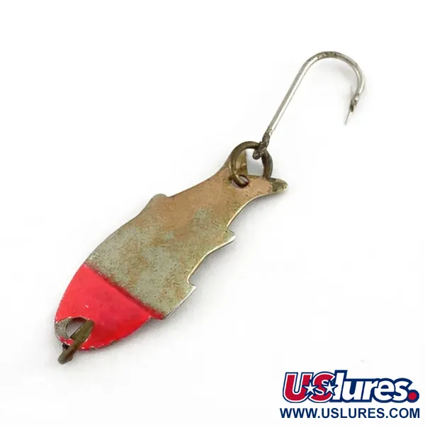En livlig röd färgmarkerad nos pryder detta skeddrag med kopparkropp, vilket ger ett tydligt tvåfärgat utseende. Denna Shoff's Triple Teazer, med produktkod 23602, mäter 3 cm och väger endast 1,1 g. Betet är tillverkat i USA och har en stansad fiskformad profil med en utsvängd stjärtsektion där enkelkroken är fäst. Komponenterna är funktionella och inkluderar en mässingsfärgad ring som kopplar samman kroken med kroppen. När det gäller dess skick (4/5), uppvisar metallytorna visst lätt slitage och matthet i den ursprungliga finishen, även om de röda detaljerna förblir tydliga och välbevarade. Sportfiskare använder vanligtvis sådana lätta skeddrag för ultralätt spinnfiske eller som en eftersläpande attraktor. Linögat sitter direkt i den målade nossektionen, vilket framhäver den slanka profilen.