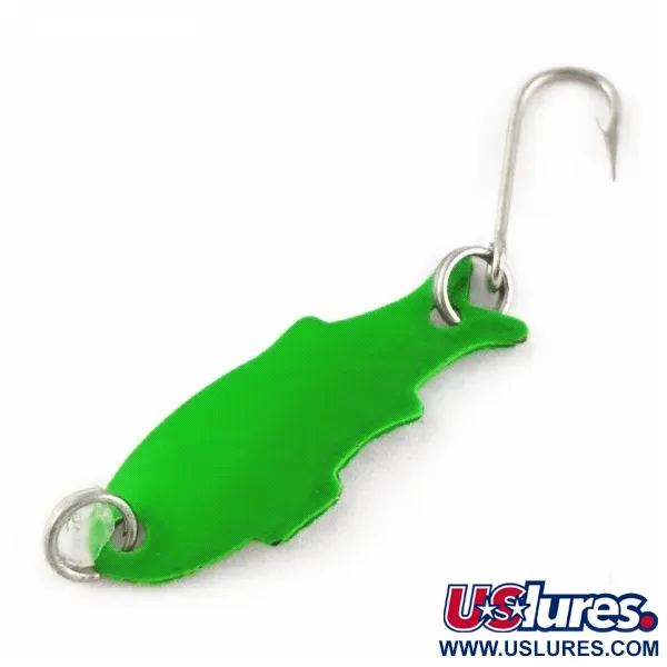 Den klargröna färgen fångar genast blicken på detta lilla metallbete tillverkat i USA. Med en vikt på endast 1/32 oz (1 g) är detta Shoff's Triple Teazer katalogfört under produktkod 24070 och erbjuder en inblick i vintage ultra-light-utrustningens historia. En kropp i stansad metall ger en slank fiskliknande silhuett med en längd på 1 1/4 tum (3 cm). Utrustningen består av en silverfärgad krok med långt skaft baktill och fjäderringar i båda ändar för enkel montering. Detta exemplar är i skick 5/5, med en ren och jämn finish utan tecken på slitage. Shoff's betesdesign var ofta inriktad på att vara ett alternativ med hög synlighet för sportfiskare som jagade mindre arter i sötvatten.