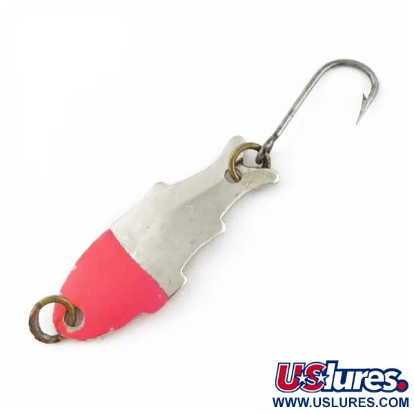 En lysande röd finish täcker nosen på detta skeddrag på 1/32 oz (1 g), vilket ger en skarp kontrast mot den polerade nickelkroppen. Detta drag, känt som Triple Teazer och tillverkat av Shoff's i USA, har en tydlig fiskprofil präglad i metallen. Med en längd på 1 1/4" (3 cm) levereras det utrustat med en enkelkrok vänd uppåt och fjäderringar i mässingston. Produktkoden 24071 identifierar denna specifika ultralätta modell, som ursprungligen skapades för den finessrika presentation som krävs för öring eller abborre. Den reflekterande nickelytan kombineras med ett matt rött parti för att skapa en visuell huggpunkt. Detta exemplar framstår som exceptionellt välvårdat och får betyget 5/5 för sin intakta finish och rena komponenter. Enkelkroken är fäst vid stjärten, medan nosringen ger en stabil fästpunkt för tunna linor.