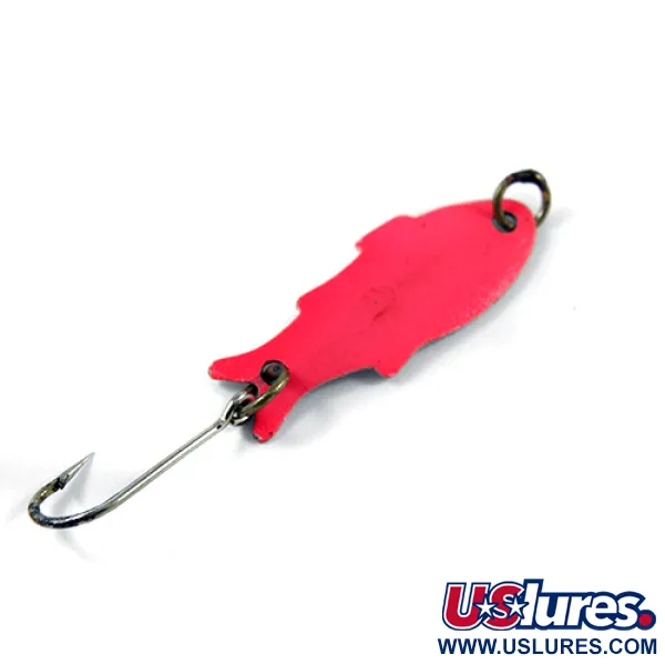 En livfull röd finish täcker ovansidan på detta fiskformade bete, vilket kontrasterar mot den rena vita undersidan. Shoff's Triple Teazer (produktkod 2420) tillverkas i USA och är ett fjäderviktsexemplar på endast 1/32oz (1,1g). Den 1 1/4" (3cm) stansade metallkroppen har en distinkt profil, komplett med subtila finkonturer stansade direkt i metallen. Monteringen består av enkla, funktionella fjäderringar i båda ändar som håller en vass enkelkrok avsedd för lätt kastfiske eller jigging. Skicket bedöms som 4/5 och visar endast mindre tecken på sin ålder, medan kroken förblir blank och färgövergången från rött till vitt är väl definierad längs kanterna.