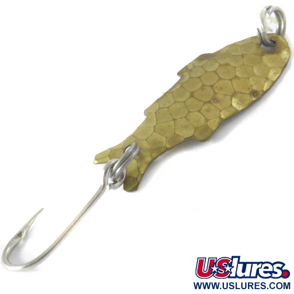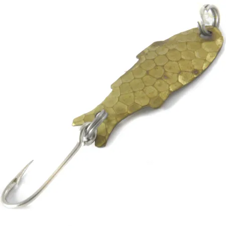 Den hamrade mässingstexturen ger detta vintage skeddrag ett distinkt fjälliknande utseende, vilket hjälper det att efterlikna små betesfiskar i klart vatten. Med sina 3 cm (1 1/4") och en vikt på 1,1 g (1/32 oz) är Shoff's Triple Teazer en ultralätt klassiker från USA. Detta exemplar, med produktkod 4099, är i skick 4/5 med rena ytor och väldefinierade stansade fenor längs kanterna på den fiskformade kroppen. Det är utrustat med silverfärgade fjäderringar i både nos och stjärt, kombinerat med en vass enkelkrok. Silhuetten efterliknar en liten småfisk, komplett med en avsmalnande stjärt och ett något bredare huvud. Den hamrade finishen på framsidan skapar en mångfacetterad ljusreflektion, medan den konkava baksidan förblir slät, vilket gör att den ursprungliga mässingsfärgen syns tydligt.