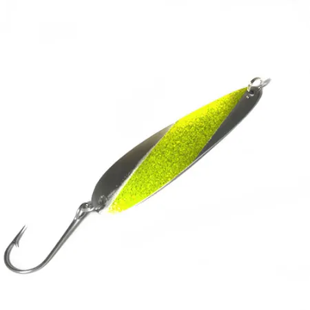 Med en vikt på 11,5 g (2/5 oz) har detta Slammer skeddrag en karaktäristisk diagonal guld-glitterrand över en polerad nickelkropp. Denna trollingspecialist på 9,5 cm (3 3/4") tillverkas i USA och har tillverkarens namn stämplat på den rena baksidan av nickel. Modell 0480 är utrustad för tungt arbete med en enkel, kraftig krok fäst via en robust fjäderring, en uppsättning som föredras av sportfiskare i stora sjöar och kustområden för att säkra arter med starka käkar. Finishen ger en högkontrastblixt som kombinerar nickels reflekterande egenskaper med det texturerade skimret från guld-chartreuse-accenten. Med ett skickbetyg på 4/5 behåller metallytorna sin ursprungliga lyster och hårdvaran förblir tät och funktionell. Slammer 0480:s långsmala profil är designad specifikt för trollingens jämna takt och är formad för att gå stabilt i olika hastigheter.