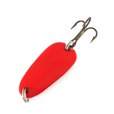 Detta skeddrag från Sølvkroken Special Classic UV-serien mäter kompakta 1 1/4" (3 cm) och har en slående fluorescerande finish som sticker ut även under sämre ljusförhållanden. Med en vikt på 1/4oz (7g) är exemplaret med produktkod 7825 byggt för kastprecision och synlighet på djupt vatten. Den mattröda utsidan förvandlas under UV-ljus, vilket visas i den andra bilden, och ger ett tydligt sken avsett för användning i mörkare miljöer eller på djupet. Den bronserade trekroken, som är fäst via robusta fjäderringar, är välbevarad och återspeglar varumärkets höga tillverkningsstandard. Betets yta är i utmärkt 5/5-skick och har en jämn och livfull beläggning över hela kroppen.