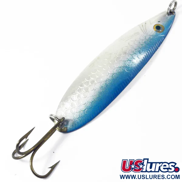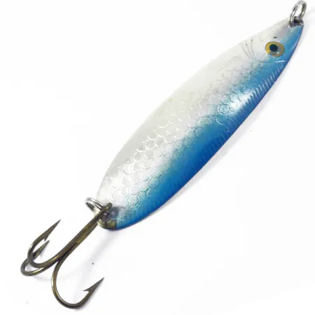 Silverfjällmönster med ett livfullt blått skimmer längs kanten definierar finishen på detta klassiska norska skeddrag. Med en vikt på 1/2 oz (15 g) är Storlaksen en stapelvara för sportfiskare som jagar lax och stor öring, främst vid spinnfiske eller trolling i strömmande vatten. Draget mäter 3 1/2" (9 cm) och har den autentiska „Sølvkroken Storlaksen“-stämpeln djupt präglad på sin polerade baksida i silver. Detta specifika exemplar har produktkod 3354 och representerar det högkvalitativa metallarbete som förväntas från Norges främsta tillverkare av sportfiskeredskap. Utrustningen inkluderar en kraftig trekrok med bronsfinish monterad med en robust fjäderring, vilket gör den redo för tungt fiske. Skicket är 5/5, med anmärkningsvärt rena ytor och skarpa detaljer på den mönstrade framsidan. En extra fjäderring i nosen ger en säker fästpunkt för direkt lina eller lekare.