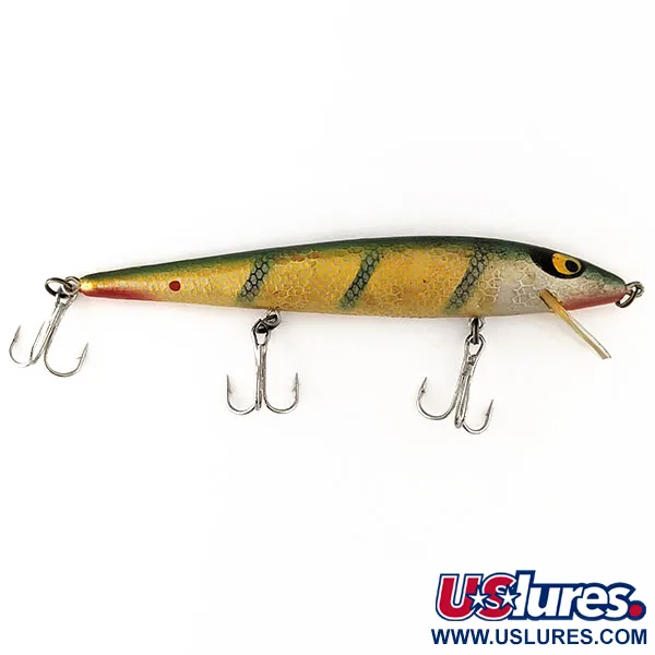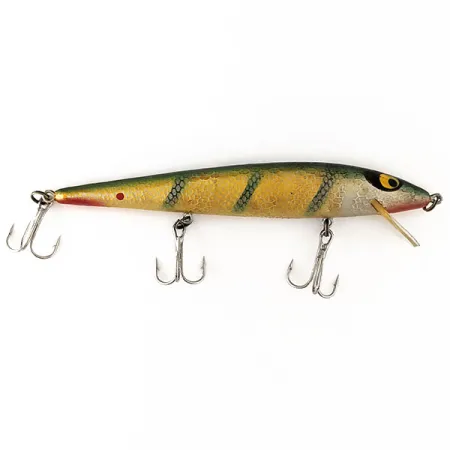Abborrfärgade vertikala ränder över en varm guldkropp definierar estetiken hos denna Smithwick Suspending Rattlin’ Rogue. Med produktkod 11173 väger detta 12,07 cm långa bete 11,34 g och är en klassiker i amerikansk sportfiskehistoria. Finishen är i exceptionellt skick (5/5) och framhäver den rödtonade strupen och de ikoniska stora gula ögonen med svarta pupiller. Som en suspending-modell med interna rasselkulor håller den sig neutral i vattenpelaren. Den når djup på 0,3 m – 2 m vid kast och 3 m – 4 m vid trolling. Utrustad med tre trekrokar och en klar, rundad sked.