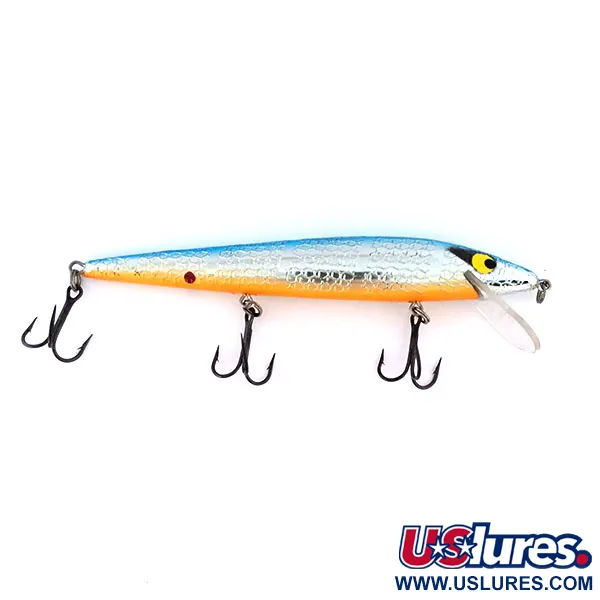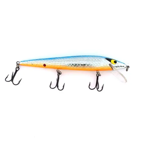 Glimrande silverskal täcker sidorna på denna 12 cm jerkbait, som övergår i en levande blå färg längs ryggen och en lysande orange buk. Denna Smithwick Suspending Rattlin’ Rogue 12, med produktkod 11035, är ett klassiskt exempel på amerikanskt hantverk, tillverkad i USA. Huvudet accentueras av ett tydligt gult öga i en svart tårformad markering, vilket är ett visuellt signum för denna modell. En liten röd prick är placerad precis ovanför den nedersta punkten nära stjärtkroken, vilket ger en subtil höjdpunkt till metallic-finishen. Som suspending-modell är detta 12g bete designat för att sväva helt stilla i vattenpelaren vid spinnstopp. Den interna rasselkammaren ger en specifik ljudprofil vid användning. Beroende på teknik tillåter den genomskinliga plastskeden ett dykdjup på 0,3 m till 2 m vid kastfiske, medan trolling kan ta ner betet till 3 m eller 4 m. Detta exemplar är i 5/5 skick, med ren lack och tre vassa trekrokar monterade med originalfjäderringar.