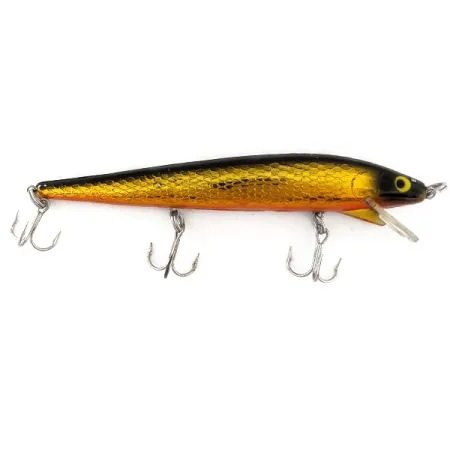 Med en vikt på exakt 12 g (2/5 oz) är den guldfärgade fjällfinishen på denna jerkbait anmärkningsvärt detaljerad över hela dess längd på 12 cm (4 3/4"). Denna Smithwick Suspending Rattlin’ Rogue 12, med produktkod 11379, har en slående estetik med hög kontrast: svart rygg, guldfärgade sidor och en klarorange buk. Tillverkad i USA och utrustad med tre vassa silverfärgade trekrokar samt ett internt rasselsystem. Som suspending-modell är den konstruerad för att sväva neutralt i vattnet; den når djup på 0,3–2 m vid kast och dyker till 3–4 m vid trolling. Skicket på detta exemplar är 5/5 då det är oanvänt och saknar tecken på slitage på den genomskinliga hakskeden eller de framträdande gula ögonen med svarta pupiller. En liten silverlogotyp är synlig på hjässan, vilket förstärker den autentiska känslan hos detta klassiska amerikanska bete.