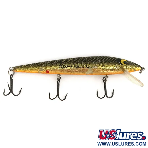 Guldtonade fjäll i Avocado Shad-mönster täcker den slanka kroppen på denna vintage Smithwick Suspending Rattlin’ Rogue. Betet är 11,5 cm (4 1/2") långt och utrustat med tre trekrokar samt bär den för produktkod 7441 typiska 'SUSPENDING ROGUE'-stämpeln på buken. Vikten på 10 g (1/3 oz) är balanserad för en svävande presentation, vilket gör att den når djup på 0,3 m till 2,0 m vid kast och 3,0 m till 4,0 m vid trolling. Detta exemplar är i skick 4/5 med lätta spår av användning på fjällmönstret och den klara skeden. En intern rasselkammare ger ljud ifrån sig vid hemtagning, vilket fullbordar den tekniska profilen hos denna klassiska amerikanska jerkbait.