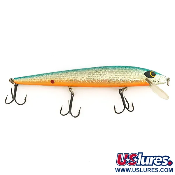 En livlig orange buk kontrasterar skarpt mot de silverfjälliga sidorna på denna Smithwick Suspending Rattlin’ Rogue, listad under produktkod 7496. Kroppen mäter 11,5 cm (4 1/2") och väger 10 g (1/3 oz), toppas av en blågrön rygg och är markerad med en klassisk röd gälfläck. Detta exemplar är i utmärkt skick (5/5), där fjällmönster och finish inte visar några tecken på användning. Designad med en klar sked når den djup på 0,3–2 m vid spinnfiske, eller upp till 3–4 m vid trolling. Tre mörka trekrokar är säkert monterade på undersidan. Den interna rasselkammaren och den neutrala flytkraften (suspending) är tekniska kärnegenskaper hos detta USA-tillverkade bete. Svart-gula ögon placerade nära nosen fullbordar profilen.