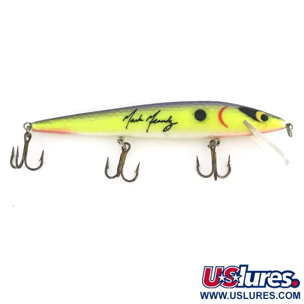 Chartreuse sidor med en djuplila rygg definierar den slående färgpaletten på detta 12 cm (4 3/4") jerkbait. Detta Smithwick Suspending Rattlin’ Rogue, med produktkod 8404, är en Mark Menendez-signaturutgåva, tydligt märkt med proffsfiskarens signatur längs sidan. Med en vikt på 12 g (2/5 oz) är betet konstruerat för specifika djup: det når 0,3 m till 2 m (1 ft - 6,5 ft) vid spinnfiske och dyker till mellan 3 m och 4 m (10 ft - 13 ft) vid trolling. En anmärkningsvärd egenskap hos detta exemplar är dess luminescens; vid svaga ljusförhållanden avger kroppen ett starkt grönt sken, medan den karakteristiska svarta axelpunkten och den röda gälbågen förblir tydliga. Den interna rasselkammaren ger akustisk närvaro vid hemtagning. Tre vassa trekrokar sitter monterade på undersidan och den klara skeden är helt intakt. Denna amerikanska klassiker är bevarad i skick 5/5 och uppvisar den rena finish och livfulla färg som förväntas av ett högkvalitativt samlarobjekt.