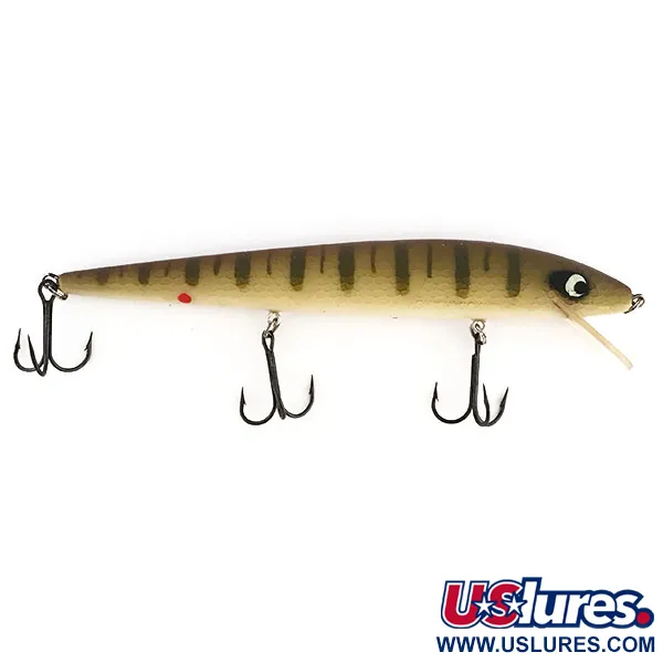Ett klassiskt gäddmönster med mörka vertikala ränder över en tan-brun gradient pryder den 14 cm (5 1/2") långa kroppen på detta vintagebete. Smithwick Suspending Rattlin’ Rogue, med produktkod 8906, är designad för neutral flytkraft (suspending), vilket gör att den hänger kvar i huggzonen vid kast på djup mellan 0,3 m och 2 m. Vid trolling tar den klara skeden ner betet till intervallet 3 m till 4 m. Detta exemplar är i 5/5 skick och har kvar sin skarpa finish med de karakteristiska vit-svarta ögonen och en röd huggpunkt vid den bakre kroken. De tre trekrokarna sitter säkert på den 14 g (1/2 oz) tunga kroppen som inrymmer ett internt rasselsystem typiskt för Smithwicks vintageproduktion.