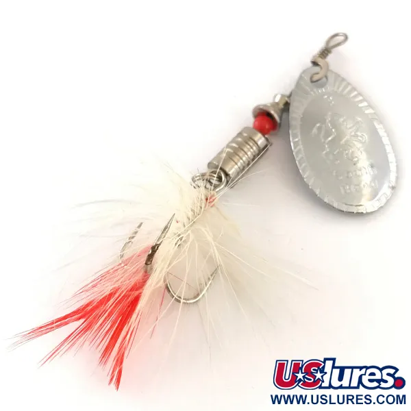 1/4oz (7g) vikt ger ballasten för denna USA-tillverkade South Bend 3, vilket gör den till ett pålitligt val för distanskastning. En blank nickelfinish täcker den ovala spinnarskeden, som är tydligt stämplad med tillverkarens emblem. Ovanför den viktade, räfflade metallkroppen fungerar en liten röd pärla som distans och visuell kontrastpunkt. Änden av detta 7 cm (2 3/4") långa drag har en trekrok som är skickligt bunden med naturliga vita fjädrar och ett stänk av rött nära skaftet. Med produktkod 4184 är denna spinnare i 5/5-skick och visar inga tecken på tidigare användning. Nickelförsänkningen på både sked och kroppsdelar behåller sin ursprungliga lyster, kännetecknande för South Bends produktionsstandarder från mitten av århundradet.