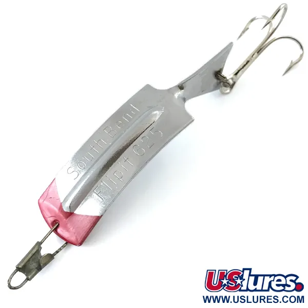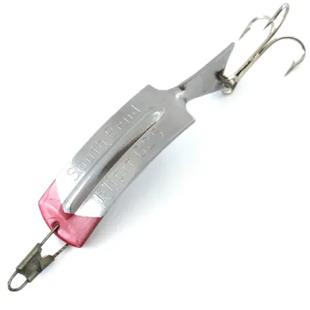 Tydligt instämplat i den polerade nickelytan identifierar märkningarna "South Bend" och "FLIPIT 625" denna amerikanska klassiker från mitten av seklet. Med en vikt på 8,5 g (1/3 oz) och en längd på 6 cm (2 1/4") har detta exemplar en tydlig röd målning vid nosen som ger en skarp kontrast mot den silverfärgade kroppen. Detta specifika bete, katalogiserat under produktkod 5520, exemplifierar det funktionella metallarbete som var typiskt för South Bends produktion i USA. Konstruktionen består av en böjd metallplatta som avslutas i en upphöjd stjärtfena, där en silverfärgad trekrok är fäst via en stadig anslutningspunkt. Vid den främre kanten rymmer en trådögla en beteslås av vintagemodell för säker riggning. Skicket är klassat som 5/5, med en ljus, reflekterande finish och välbevarad färg. Flipit-seriens geometri utvecklades specifikt för spinnfiske och trolling, och utnyttjar det viktade centrumet och den unika stjärtformen för att bibehålla stabilitet under hemtagning genom vattenpelaren.