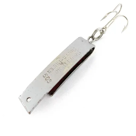 På metallkroppen syns tydligt instämplat "SOUTH BEND SUPER-DUPER 503", en beteckning för en design som blivit en stapelvara i öringaskar över hela USA. Den karakteristiska U-formade böjningen på detta 3,5 cm (1 1/2") långa metallbete är utformad för att greppa vattnet på ett sätt som få andra skeddrag klarar, vilket gör det till ett pålitligt val för både spinnfiske och trolling med tunn lina. Detta exemplar har en klassisk finish i nickel med röd insida, även om en del röd färg har nötts bort vid den nedre framkanten efter år av användning. På den övre kurvan är märkningen "PAT PEND'G" fortfarande tydlig, ett litet fönster mot den tid då South Bend först introducerade denna okonventionella silhuett på marknaden. Med en vikt på 4,3 g (1/8 oz) är det ett mångsidigt verktyg för fiske efter öring, abborre och gädda. Monteringen är enkel med en fjäderring som fäster en vass trekrok i stjärtänden. Betet är i skick 4 av 5, med fin nickelplätering och mycket läsbara fabriksstämplar.