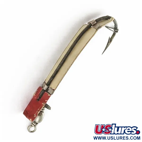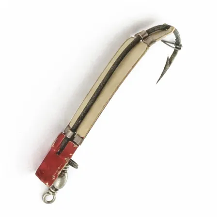 Denna vit-röda flugvickel med en längd på 4,5 cm är en klassisk South Bend-skapelse från 1940-talet. Trix-Oreno bär produktkod 24087, väger lätta 2 g och utvecklades specifikt för att hjälpa flugfiskare att nå djupare vattenlager. Designen kännetecknas av en slank, benvit kropp som är lindad mot kroken med metallband och kompletteras av ett distinkt rött huvud. Betet har skicket 4/5 och uppvisar endast lätta spår av sin ålder, medan färg och metalldelar är välbevarade. Historiskt sett var South Bends tanke att betet skulle kastas tvärs över eller nedströms i rinnande vatten, där det sjunker naturligt för att imitera vattenlevande organismer. Detta rörelsemönster visade sig vara effektivt för att nå öring tidigt på säsongen eller för att locka större fisk på djupt vatten under sommaren. Detaljerna inkluderar ett litet lekande i fästpunkten och en enkel, uppåtvänd krok baktill.