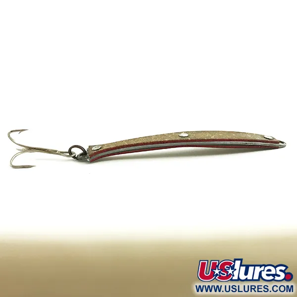 Med en vikt på exakt 1/2oz (14g) definieras profilen på detta vintage-skeddrag av sin skiktade utformning och gnistrande guldglitterfinish. Sparky Jr. Spoon Sparkling Minnow, med produktkod 5751, representerar en amerikansk design från mitten av 1950-talet (1951). Längs kanterna skapar en djup röd ton en tvåfärgad effekt mot den texturerade guldkroppen, som hålls samman av tre framträdande silverfärgade nitar. Den autentiska "SPARKY JR"-stämpeln är inpressad i materialet och förblir tydlig och läsbar genom finishen. Med sina 3 1/2" (9cm) är detta exemplar i 5/5-skick, med en välbevarad utsida och blanka metalldelar. En klassisk trekrok är fäst i bakänden, lämpad för spinnfiske eller trolling.