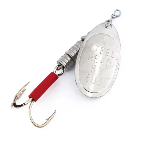 Förnicklingen ger en högreflekterande yta på det ovala skedbladet på denna USA-tillverkade Yakima Bait-spinnare, en design som ofta föredras för sitt fiske i strömmande vatten. Texten "4 STEEL HEAD BY BUD" är tydligt stämplad i metallen, vilket identifierar dess specifika ursprung och syfte inom Yakima Baits sortiment. Betet, som är katalogiserat under produktkod 10635, mäter 7 cm och väger 9 g, vilket ger tillräcklig tyngd för precisa kast i älvsträckor. En distinkt röd slang täcker trekrokens skaft, medan en liten röd pärla sitter precis under bygeln på tråden. Kroppen består av en serie staplade metallpärlor som ger vikt och stabilitet åt konstruktionen. Detta exemplar är i 4/5-skick, med endast små tecken på hantering samtidigt som den blanka, reflekterande finishen på originalförnicklingen är bevarad. Komponenterna sitter stadigt, vilket speglar den hållbara tillverkningsstandard som är typisk för vintagefiskeutrustning producerad i USA.