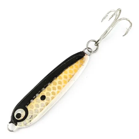 Med en rejäl vikt på 19 g (2/3 oz) är detta USA-tillverkade skeddrag ett klassiskt exempel på Stingers funktionella design. Kroppen på 5,5 cm (2 1/4") har en distinkt svartvit bas, accentuerad av ett framträdande bikakemönster i en varm gul-guldig ton över mittpartiet. En tydlig svart prick sitter precis bakom det stora ögat för att imitera bytesfiskens naturliga huggpunkter. Detta bete, identifierat med produktkod 21478, har en strömlinjeformad profil avsedd för långa kast och presentationer på djupt vatten. Komponenterna är robusta, med en stark fjäderring som ansluter till en vass trekrok, allt med en anmärkningsvärt ren finish. Att hitta ett exemplar i ett så välbevarat skick – klassat som 5/5 – understryker kvaliteten hos dessa vintagebeten. Ögat i den främre änden är utfört i svart och vitt, vilket ger realism åt den mörka ryggen som kontrasterar skarpt mot den polerade silverfärgade buken.