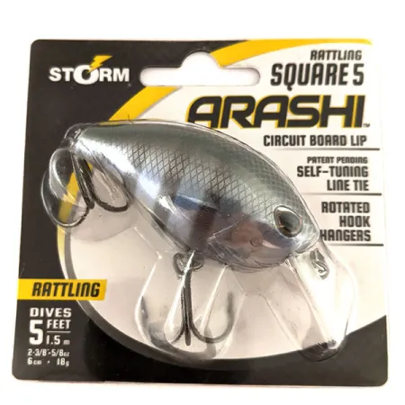 Med en vikt på 18 g (2/3 oz) erbjuder denna wobblers Bluegill-finish en realistisk profil av en betesfisk som passar för olika vattenförhållanden. Storm Arashi Rattling Square 5, med produktkod 11332, är konstruerad för att dyka till ett djup av 1,5 m (5 ft) med sin tunna, hållbara dyksked av kretskortsmaterial (GFK). En framstående teknisk funktion är den självjusterande linöglan (self-tuning line tie), en frirörlig konstruktion avsedd att bibehålla en rak gång under invevning. Betet är 6 cm (2 1/4") långt och utrustat med roterade kroköglor som placerar VMC-krokarna närmare kroppen för att minska risken för bottennapp. Detta exemplar är oanvänt i originalförpackning, vilket motsvarar skickbetyg 6. Den interna rasselkammaren ger ett tydligt ljudavtryck, och tillverkningslandet är Indonesien. Kraftig hårdvara och square-lip-designen är skräddarsydda för att studsa av hinder som timmer eller stenar.