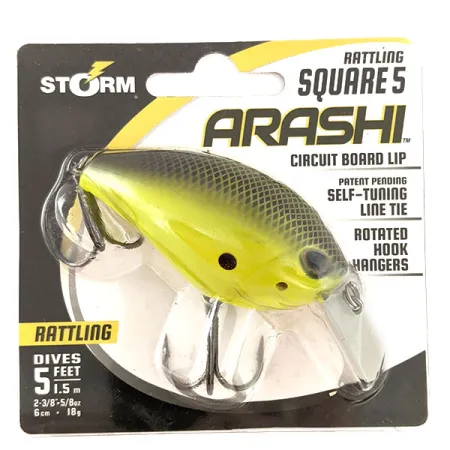 Storm Arashi Rattling Square 5 är konstruerad med en tunn, hållbar sked av kretskortsmaterial och är utformad för att nå sitt simdjup på 1,5 m (5 fot) snabbt, även vid låga hastigheter. Med en vikt på 18 g (2/3 oz) och en kroppslängd på 6 cm (2 1/4") har detta exemplar det kontrastrika Black Chartreuse Shad-mönstret, känt för sin mörka rygg med fjälltextur och tydliga sidopunkt. Utrustningen på detta oanvända bete inkluderar premium VMC-krokar säkrade i roterade kroköglor, ett designval som syftar till att minska bottennapp genom att hålla krokarna tätare mot kroppen. För konsekvent gång vid kast eller trolling har den en patentsökt självjusterande linögla som medger fri rörlighet. Betet har produktkod 11335 och levereras i originalförpackning som beskriver den interna rasselkammaren och dess flytande egenskaper. Denna specifika enhet är monterad i Indonesien.