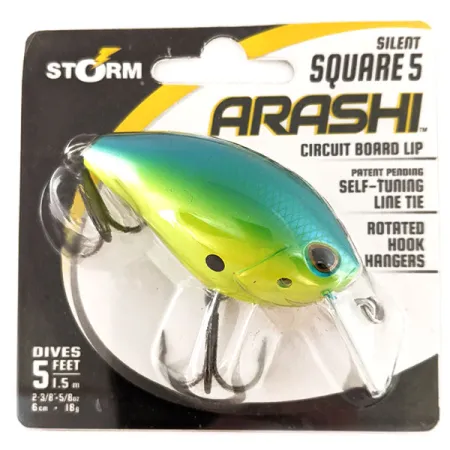 Klart lysande "Parrot"-färger skiftar från livlig limegrön till djup kricka på ryggen av denna Storm Arashi Silent Square 5, produktkod 11706. Betet är byggt för precis kontakt med strukturer och har en tunn sked av kretskortsmaterial designad för att nå ett djup på 1,5 m. Med en vikt på 18 g och en kompakt kropp på 6 cm har konstruktionen en självjusterande linögla som håller betet rakt genom vegetation och bråte. Hårdvaran består av VMC-krokar monterade på roterade kroköglor, vilket håller krokarna tätare mot kroppen för att minimera risken att fastna. Detta exemplar levereras i originalförpackning från Indonesien och är oanvänt. Det är den tysta versionen av Arashi-serien, som förlitar sig på sin profil och vattenförflyttning snarare än interna rasselkulor.