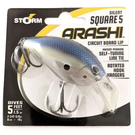 Med en vikt på 18 g (5/8 oz) har kroppen en blåfjällig rygg som övergår i silvervita sidor med en tydlig mörk fläck. Storm Arashi Silent Square 5, produktkod 11951, mäter 6 cm (2-3/8") och är utrustad med en tunn sked av kretskortsmaterial för att nå ett djup på 1,5 m (5 ft). Denna tysta crankbait använder en självjusterande linögla, en frirörlig design avsedd att bibehålla en rak gång vid hemtagning. För bättre prestanda i vegetation gör de roterade hakhållarna att VMC-krokarna ligger tätt mot betets profil, vilket minskar risken för bottennapp. Tillverkat i Indonesien ger betet en rullande gång med en tydlig stjärtkick. Detta specifika exemplar är oanvänt och är graderat som 6.