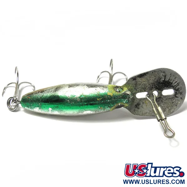 Med en vikt på 1/4oz (6,5g) kommer denna tidiga Storm-skapelse från eran före Rapalas uppköp av företaget. Just denna Hot'N'Tot Thin Fin, med produktkod 0033, mäter 2 3/4" (7cm) och har den traditionella metallskeden som skickar ner betet till djup mellan 1,5 - 4 m (5 - 13ft). Färgmönstret Steel / Green uppvisar en reflekterande metallkropp med en mörkgrön ovansida och tydliga gula markeringar runt ögonen. Samlare kommer att uppskatta dess autentiska 4/5-skick, som visar de lätta ytmärken man förväntar sig av ett äkta vintage-bete tillverkat i USA. Det är riggat med två buksatta trekrokar, redo för spinnfiske eller trolling efter arter som gös och gädda. Den metalliska finishen förblir blank trots sin ålder, vilket speglar dess ursprung som ett högkvalitativt amerikanskt verktyg för den seriöse sportfiskaren.