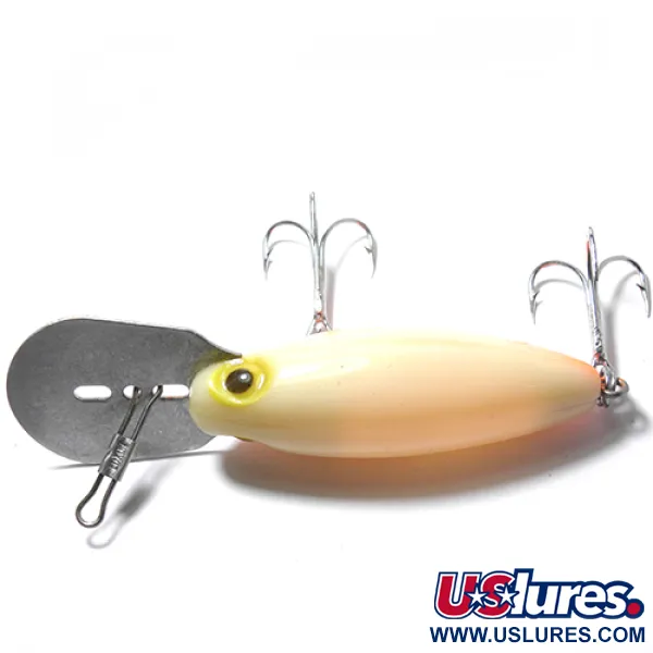 Den orange-gula färgsättningen täcker kroppen på denna Storm Hot'N'Tot Thin Fin, vilket gör den till ett mycket synligt val för varierande vattenförhållanden. Med en vikt på 12 g (2/5 oz) och en längd på 9 cm (3 1/2") är denna flytande vobbler konstruerad för att nå djup på 1,5–4 m (5–13 ft). Designen, med produktkod 0042, kännetecknas av den ikoniska överdimensionerade metallskeden med integrerat beteslås, en konfiguration synonym med djupgående prestanda i den klassiska USA-tillverkade Storm-serien. Detta exemplar, med skicket 5/5, har kvar sin originalfinish och vassa trekrokar utan tecken på användning. Den är specifikt avsedd för fiske efter gös, abborre och gädda, oavsett om den används för driftfiske, spinnfiske eller trolling. Övergången från den blekgula ovansidan till den klara orange buken är tydlig, kompletterad med ett gult inramat öga som ger en fokuserad huggpunkt.
