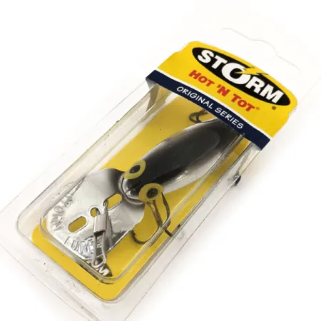 Silvermetallic fjäll kontrasterar mot en helsvart rygg på denna 5 cm (2") långa Storm Original Hot'N Tot. Som en del av "Original Series" har denna modell den klassiska dykskeden i metall som gör att den når djup på 1,5 m till 4,0 m (5 ft till 13 ft). Detta specifika bete, med produktkod H103 (intern databas 12897), är en modell på 6,5 g (1/4 oz) som ofta används för trolling, spinnfiske eller drifting. Tillverkad i Indonesien, inkluderar konstruktionen VMC-krokar av hög kvalitet och de karaktäristiska överdimensionerade gula ögonen med svarta pupiller. Förpackningen har en copyright från 2012 och identifierar färgen som "MET SLV/BLK BACK". Detta bete är oanvänt och ligger kvar i sin ursprungliga genomskinliga blisterförpackning med det gula "Think Like A Fish"-kortet. Den stansade metallskeden sitter stadigt fast, vilket understryker den hållbarhet som förväntas av denna specialiserade djupgående design.