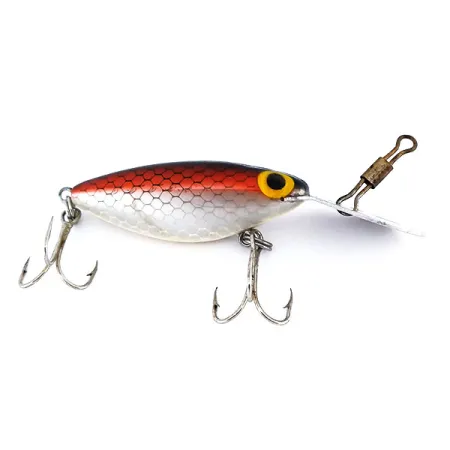 Röda fjällmönster övergår i en silverfjällad kropp på denna klassiska Storm Original Hot'N Tot. Med en vikt på 1/4 oz (6,5 g) och en längd på 2" (5 cm), härstammar detta exemplar från pre-Rapala-eran när Storm tillverkade Thin Fin-serien i USA. Den överdimensionerade metallskeden är ett kännetecken för designen, konstruerad för att nå djup på 1,5–4 m (5–13 fot) vid trolling eller spinnfiske. Detta specifika bete, produktkod 9958, har tydliga gula ögon med stora svarta pupiller som sticker ut mot den metalliska finishen. Det är i 5/5-skick och uppvisar välbevarade detaljer inklusive båda trekrokarna och originallekaret med hake fäst direkt på dykskeden. Ursprungligen avsedd för arter som gös, abborre och gädda, är den flytande konstruktionen ett bevis på vintage amerikansk sportfisketillverkning.