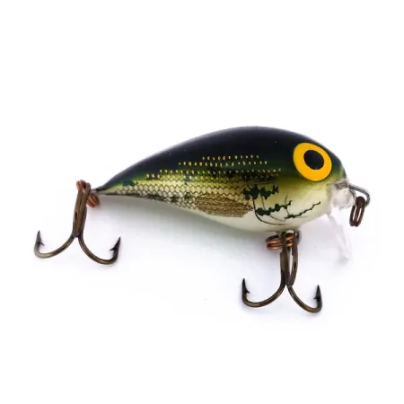 Denna kompakta crankbait väger 5,5 g (3/16 oz) och representerar Storms klassiska era innan varumärket köptes upp av Rapala. Färgvalet Baby Bass är välbevarat på denna 4 cm (1 1/2") långa kropp, som har en mörkt olivgrön rygg som övergår i ett detaljerat fjällmönster längs sidorna och avslutas med en gräddvit buk. Med produktkod 10223 är detta ultralätta exemplar designat för fiske på grunt vatten med ett simdjup på 0 - 0,5 m. Dess ljudliga inre rasselkammare ger en tydlig akustisk signatur under invevning. Tillverkad i USA och utrustad med de ikoniska gul-svarta målade ögonen och en klar dyksked. Skicket är 5/5 då finishen är intakt och originalkrokarna är välskötta. Denna specifika modell är ett utmärkt exempel på Storms ingenjörskonst för grunt vatten och vegetationsrika områden.