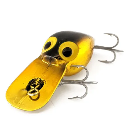 Denna djupgående flytande wobbler väger 6,5 g (1/4 oz) och representerar eran innan Storm köptes upp av Rapala. Den guldfärgade metallic-ytan framhävs av en mörk svart toning längs ryggen, kompletterad med de överdimensionerade gula ögonen som är typiska för denna vintage-serie. Med en längd på 4 cm (1 1/2") har exemplaret identifikationen «WEE WART» tydligt stämplad på undersidan av den långa skeden. Denna profil är avsedd för både spinnfiske och trolling och används ofta vid fiske efter abborre eller gös. Original-trekrokar i silverfinish sitter på buken och stjärten, vilket ger ett skickbetyg på 5/5. Produktkod 11138 identifierar detta USA-tillverkade exemplar.