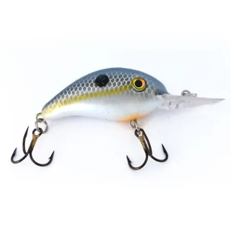 En fjällmönstrad blå och grå rygg övergår i en tydlig gul sidolinje på denna 10g (1/3oz) Strike King 4XD. Modellen med produktkod 10398 har Sexy Shad-finish med pärlemorvit buk och en subtil orange accent under skeden. Denna flytande crankbait är designad för att nå djup mellan 2,4 och 3,6 m (8-12 fot) vid kast eller trolling efter gädda och gös. De interna rasselkulorna ger en teknisk ljudprofil, medan kroppen på 5 cm (2") bibehåller en kompakt profil. Båda de bronserade trekrokarna är i utmärkt skick, vilket matchar exemplarets totala 5/5-skick. En enskild svart fläck på den övre flanken är kännetecknande för just detta färgschema. Den stora, klara dykskeden sitter säkert fast, redo för djupt vatten.