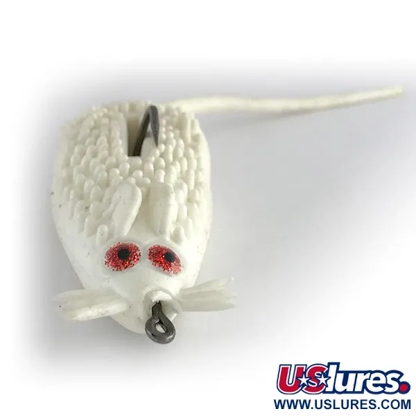 En krispigt vit finish täcker den texturerade, knottriga kroppen på denna klassiska ytgående gnagare, vilket hjälper den att sticka ut mot tät vegetation. Denna Strike King King Rat kommer från USA och är katalogiserad med produktkod 8065. Den representerar en klassisk era av vasskyddad topwater-design för fiske i tät växtlighet. Den mjuka kroppen har en enkel uppåtvänd krok som skyddas av ett djupt spår längs ryggen för att förhindra att den fastnar. Glittrande röda ögon ger en tydlig siktpunkt, medan de integrerade morrhåren och den långa svansen förstärker profilen. Vid 1/2oz (14g) och 2 1/4" (6cm) är förhållandet mellan vikt och storlek balanserat för kast in i näckrosbälten där gädda och abborre ofta gömmer sig. Detta exemplar är i utmärkt skick, betygsatt 5/5, där den vita färgen och de flexibla komponenterna förblivit anmärkningsvärt välbevarade. Linöglan är placerad direkt vid nosen för en rak och konsekvent hemtagning genom vegetationen.