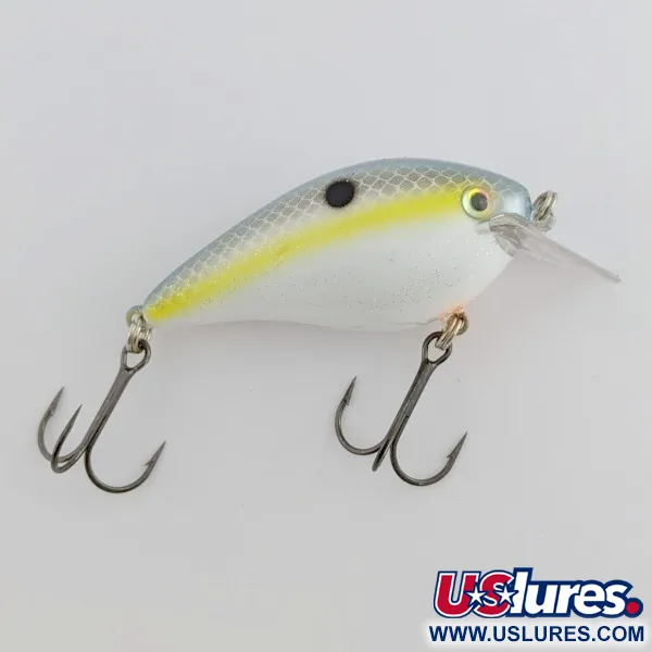En fyrkantig sked i klarplast definierar profilen på denna Strike King KVD 1.5 Silent square bill, specifikt utformad för att navigera genom tät vegetation och struktur. Detta exemplar, med produktkod 24437, är färgsatt i det ikoniska Sexy Shad-mönstret, med en skimrande blågrå fjällmönstrad rygg och en lysande gul sidolinje. En distinkt svart prick på sidan och en subtil orange accent på buken fungerar som klassiska huggpunkter för denna färgsättning. Som en "silent"-modell saknar den interna rasselkulor, vilket ger en mer naturlig presentation vid spinnfiske eller trolling i vatten med högt fisketryck. Betet väger 3/8 oz (10,6 g) och är 2 1/2 tum (63,5 mm) långt. Det är konstruerat för att nå djup mellan 0,9–1,5 m. Hårdvaran består av två vassa, mörka trekrokar. Detta bete är i utmärkt skick och får betyget 5/5 för sin rena finish och välvårdade utseende.