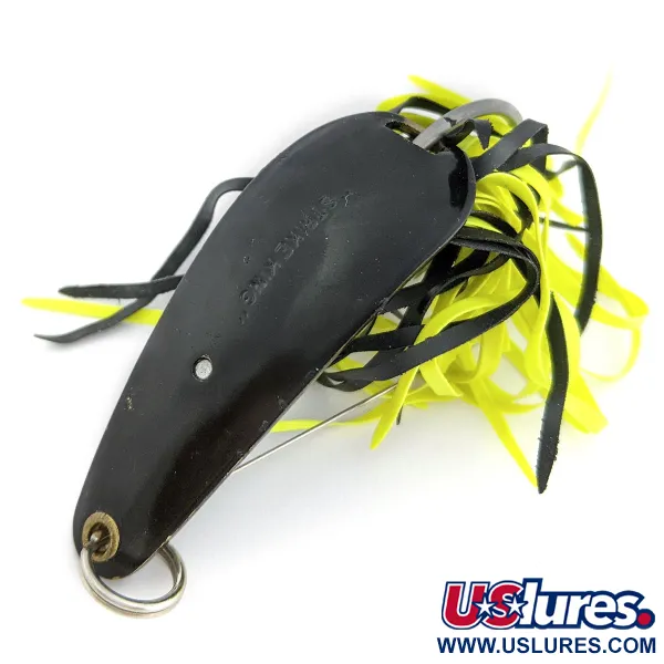 Strike King Timber King väger 14 g (1/2 oz) och är ett klassiskt vasskyddat skeddrag som vittnar om amerikansk sportfiskehistoria. Detta specifika bete (artikelnummer 17998) är 5,5 cm (2 1/4") långt och har en djupsvart finish på metallkroppen, accentuerat av en kontrasterande svart och gul gummikjol med flera trådar. Modellen introducerades ursprungligen 1979 och designades för att rikta in sig på storvuxen gädda och bass i de tätaste bråten, en era då märket fokuserade på specialiserade verktyg för fiske i kraftig vegetation. Konstruktionen inkluderar en robust enkelkrok skyddad av integrerade vasskydd i metall, vilket säkerställer att den kan navigera genom tät vegetation utan att fastna. Detta exemplar är i skick 5/5, med en ren yta på både skeden och den kraftiga fjäderringen för lininfästning. Denna USA-tillverkade raritet har sedan länge utgått ur sortimentet och representerar en funktionell del av sportfiskearvet från sent 70-tal.