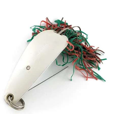 En metallkropp med pärlemorfinish och en vikt på 14 g (1/2 oz) utmärker detta exemplar av Timber King från Strike King. Draget mäter 5,5 cm (2 1/4") på längden och har tillverkarens namn tydligt stämplat på ovansidan. För fiske i tät vegetation är konstruktionen utrustad med ett fast vasskydd av metalltråd som skyddar enkelkroken, vilken är integrerad i kroppen via en skruvanordning. Stjärtpartiet är försett med en tät gummikjol bestående av en färgmix av röda, gröna och bruna trådar. Med betyget 5/5 uppvisar betet en utmärkt bevarad finish och följsamma gummikomponenter. Varje detalj, från den robusta fjäderringen i nosen till komponenterna på undersidan, speglar dess amerikanska ursprung. Denna specifika artikel är katalogiserad under produktkod 21094.