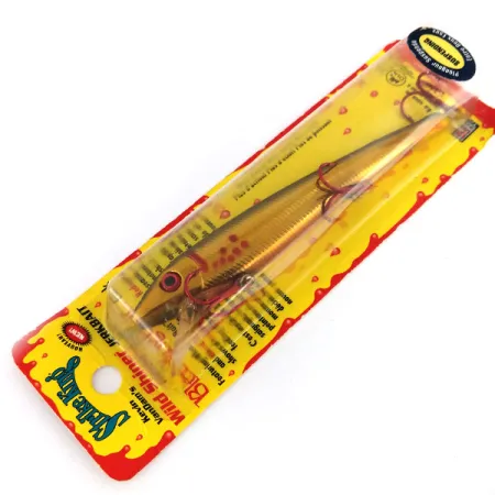 Guldfinishar som den på denna Strike King Wild Shiner är utformade för att blinka och reflektera ljus effektivt under varierande vattenförhållanden. Denna 12 cm (4 3/4") jerkbait ingår i Kevin VanDam signaturserien, kategoriserad under produktkod 9918 och identifierad med BBWSS-396-etiketten på baksidan. Den har karaktäristiska röda "Bleeding Bait" trekrokar, en teknisk detalj som syftar till att simulera ett skadat bytesdjur. Med en vikt på 17 g (3/5 oz) är betet konstruerat som en suspending-modell (svävande), designad för att hålla sin position i vattenpelaren vid spinnstopp. Vid kastfiske sträcker sig djupet från 0,3 m till 2 m (1ft till 6.5ft), medan det vid trolling kan nå djup på 3 m till 4 m (10ft till 13ft). Detta exemplar är oanvänt och bevarat i sin originalförpackning från tillverkningen i Mexiko. Den slanka profilen och det detaljerade fjällmönstret är skarpa och intakta.