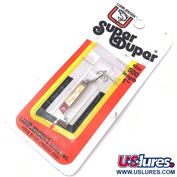 Med en längd på exakt 1" (2,5 cm) är detta metallbete ett utmärkt exempel på funktionell design från Hood River, Oregon. Gold / Red-finishen har en polerad guldpläterad kropp med en tydlig röd markering vid stjärten. Denna Super-Duper 500, katalogiserad under produktkod 3932, väger 3/64oz (1,4g) och är oanvänd i sin ursprungliga vintageförpackning. På baksidan av kortet ger Luhr Jensen & Sons, Inc. teknisk vägledning för både spinnfiske och trolling, och föreslår en långsam till medelsnabb hemtagning. Vid trolling rekommenderar tillverkaren en 18" (45,7 cm) tafs och noterar dess effektivitet när den placeras 30-50 fot (9,1-15,2 m) bakom båten. Betet är utrustat med ett fabriksmonterat beteslås och en trekrok, bevarat på sitt ursprungliga skyltkort från Luhr Jensen & Sons-eran.